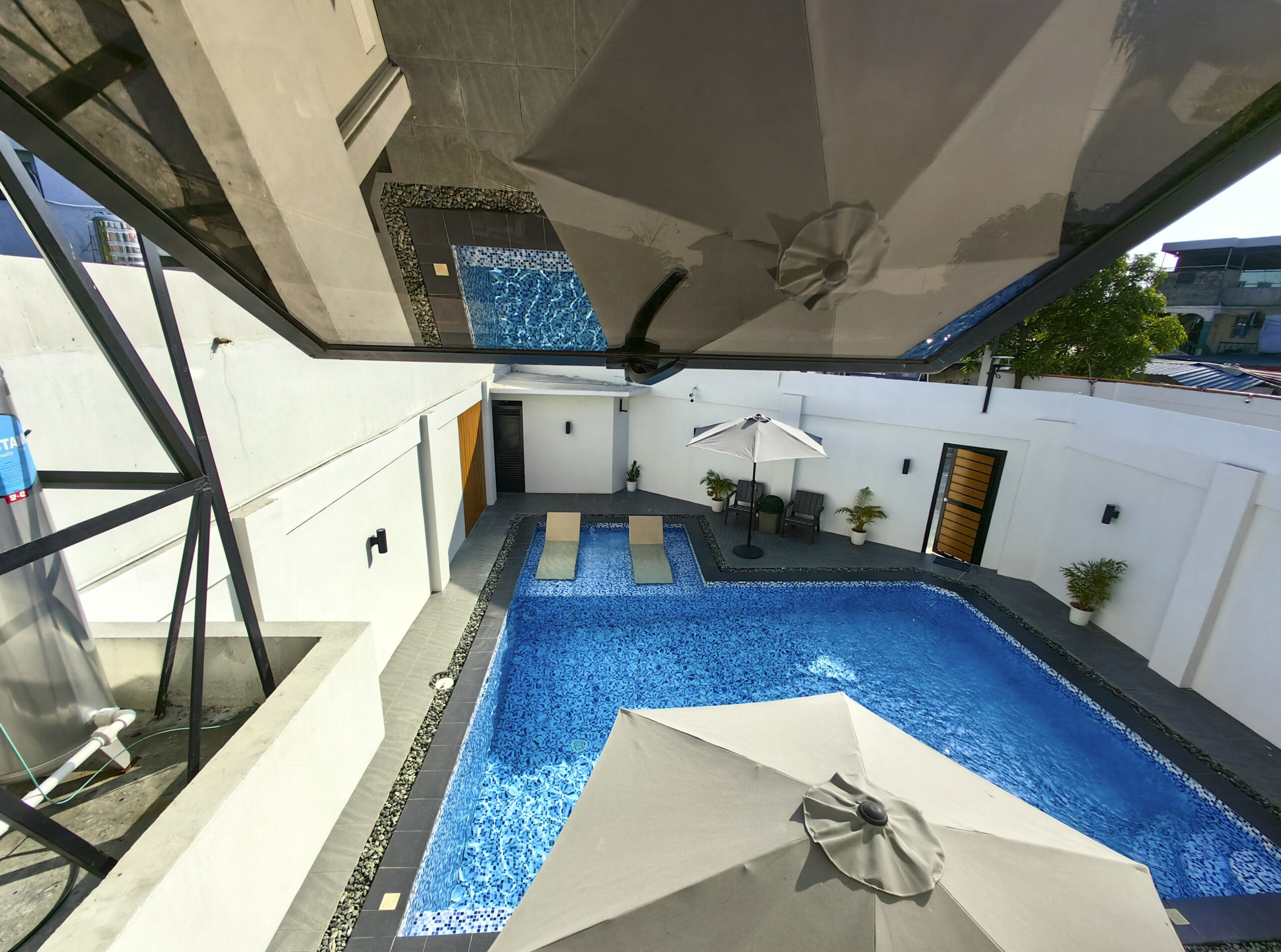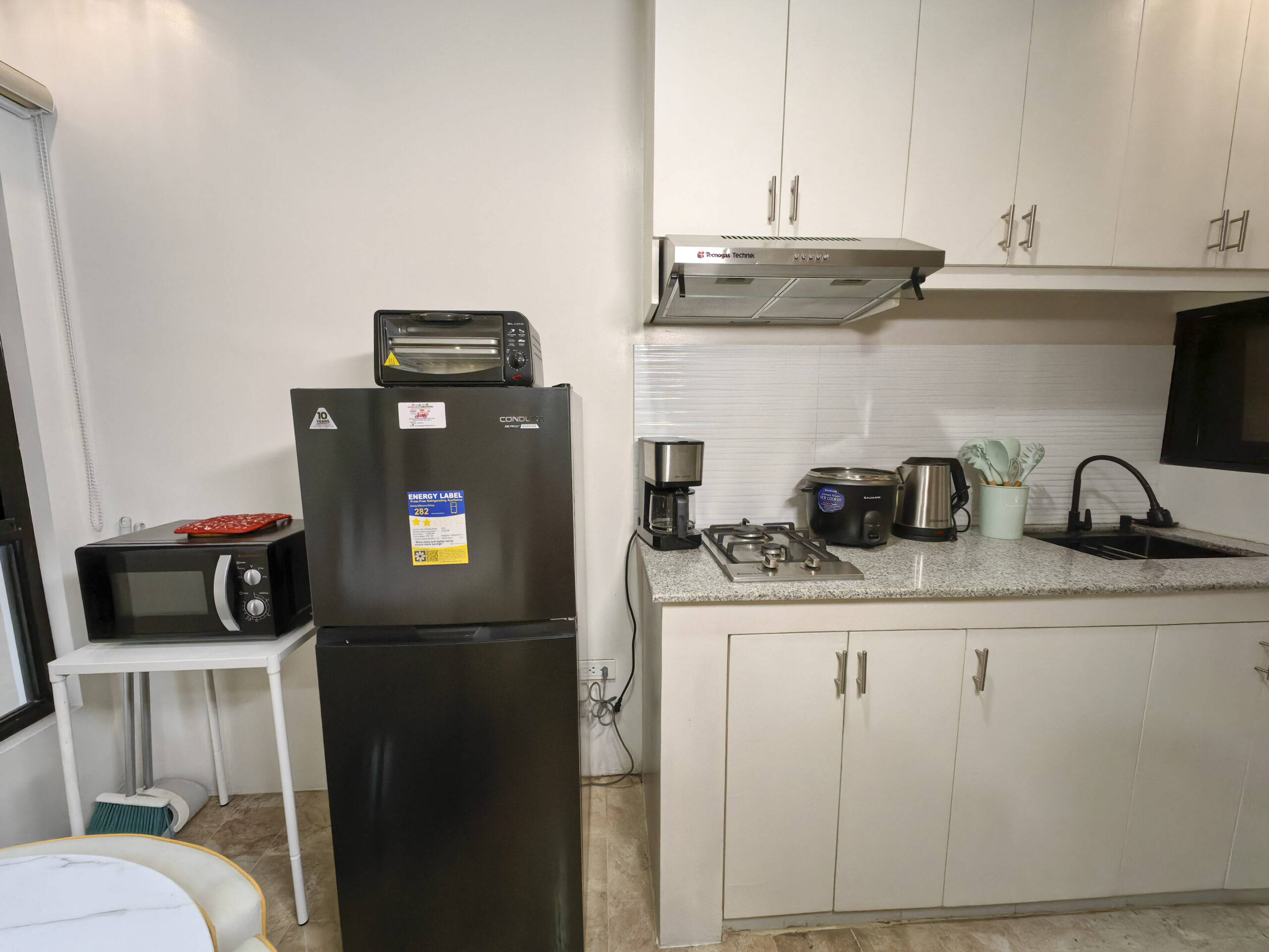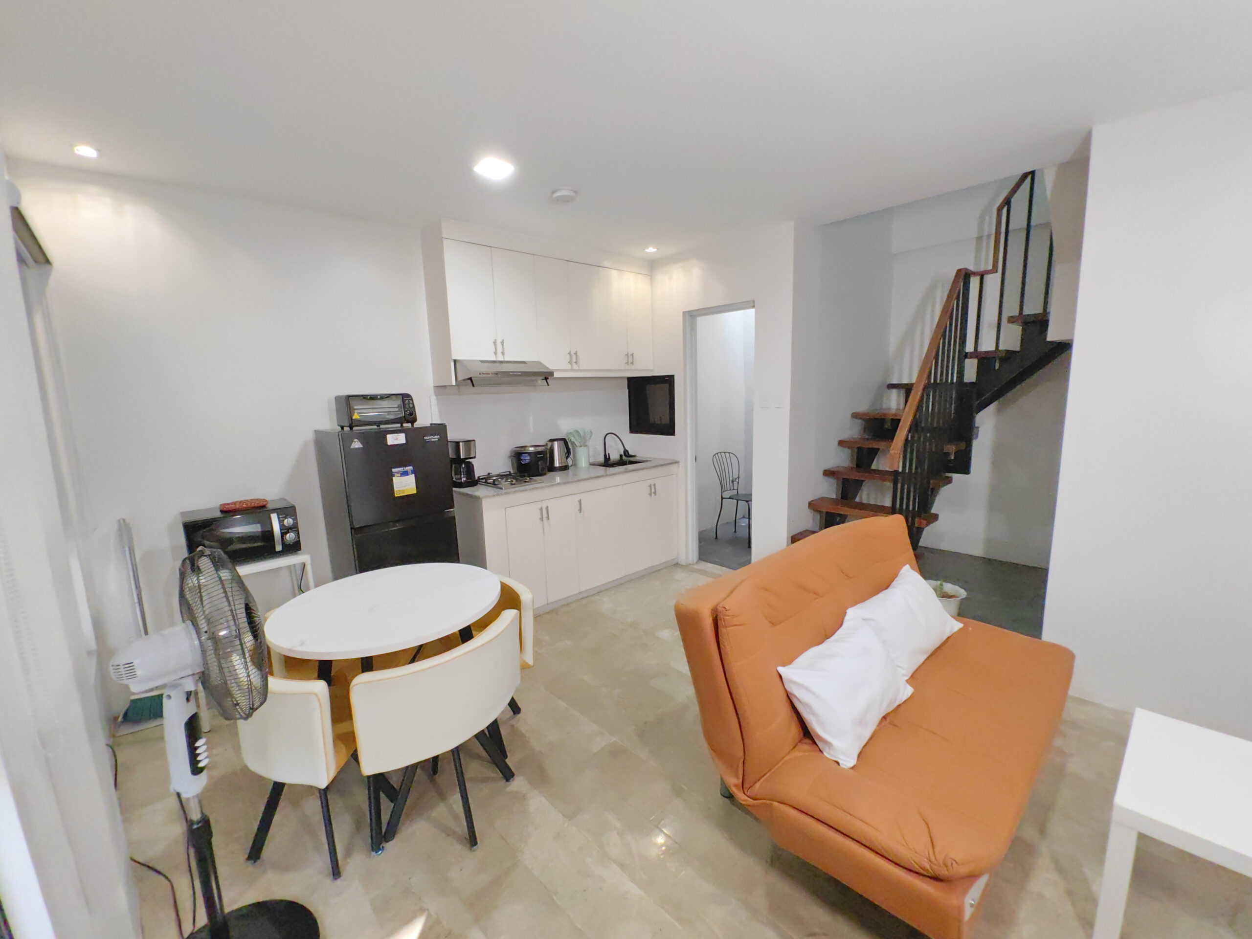 Suite is ideal for a family who are looking for a bonding time together away from the strenuous daily routine. Also, for travellers from other provinces or outside the country will find this suite an excellent alternative over hotels. This fully furnished suite is your home away from home. Suite has 2 bedrooms, each with a full double size bed on firm thick cushion with a soft topper drape in pristine white linens to enhance your sleeping experience. Blackout Korean blinds and wind free split type air conditioning ensure your uninterrupted rest. Main bedroom has a walk- in closet. Unit has a private pocket garden should you fancy for a fresh air outside the suite. Kitchen has HOB cooking equipment on granite countertop with cove lighting and equipped with double motor range hood. Complete small appliances and kitchen utensils at your disposal. Comfortable dining furniture and table setting for 6. Leather sofa bed in living room can be converted to a comfortable bed for 2. Family/living room have its own split type air conditioning to provide comfort during family time and entertainment from a 50 inches smart TV. Adequate lighting in the living and bedroom units anchored by 6 tri color pin lights augmented by lampshade and reading light in the bedroom. Bedrooms also have modern table lamp in study table which has accessible plug for your laptop. High speed internet access throughout the suite, thanks to digital Wi-Fi router and Wi-Fi extender. Bedrooms also have a 50 inches smart TV for your viewing entertainment while resting. Both bedrooms share access to a private balcony which is a perfect spot for a friendly chat with the occupants on the other bedroom. Opaque glass door provide privacy in each bedroom. Usual necessities such as flat iron, ironing board and much more are offered in this suite. Last but not the least, you will be pampered by our state of the art restroom downstairs and upstairs. Fresh white bath, hand and face towels for your convenience. Hot water available in overhead rain shower on a glass covered shower. Lighted bathroom mirror for your beauty regimen. Bidet toilet sprayer and toilet deodorizer complete your hygiene experience.
